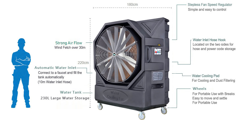 De Ya Suh Dar M502-COOL verdampingskoeler is een mobiele, adiabatische luchtkoeler voor professioneel gebruik. Dit toestel maakt deel uit van de Ya Suh Dar-serie en is bijzonder geschikt voor het koelen van zowel binnen- als buitenruimtes. Het plug-and-play toestel zorgt voor aangename temperaturen in fabrieken, industriële en productieomgevingen, restaurants en hotels. Geschikt voor oppervlakken tot 500 m² met een luchtcirculatie van 48.000 m³ per uur. Een adiabatische koeler koelt niet alleen de omgevingslucht, maar filtert ook stof en vuildeeltjes.