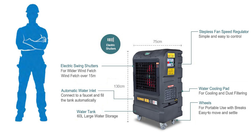 Adiabatische koeling is een energiebesparende manier van industriële koeling. Door het principe van waterverdamping wordt de lucht afgekoeld. De mobiele M902-Cool verdampingskoeler is gemakkelijk schoon te maken en te onderhouden. Met de meegeleverde slang kan het toestel direct op de waterleiding aangesloten worden, zodat de watertank automatisch te vullen is. Door de toevoeging van koelelementen kan het koeleffect nog extra verbeterd worden. Dit model bezit electrisch beweegbare lamellen, die aan-of uitgezet kunnen worden voor het creëren van een grotere reikwijdte. De ventilatorsnelheid is eenvoudig in te stellen met de energiebesparende traploze schakelaar.en zorgt voor een sterke luchtstroom. Variabel van 0 tot volle snelheid. Voor makkelijke verplaatsing of opslag zijn er handige haken op de zijkanten van het apparaat aangebracht voor het opbergen van waterslang en stroomkabel. Door de aanwezige wielen met rem is het toestel snel en gemakkelijk verrijdbaar en op iedere gewenste plek neer te zetten en te gebruiken. Kenmerken: electrisch beweegbare lamellen aanwezige noodknop aan-uit schakelaar van pomp aan-uit schakelaar van ventilator regelbare ventilatorsnelheid droogloop bescherming sterk en goed ontworpen omkasting van polyetheen